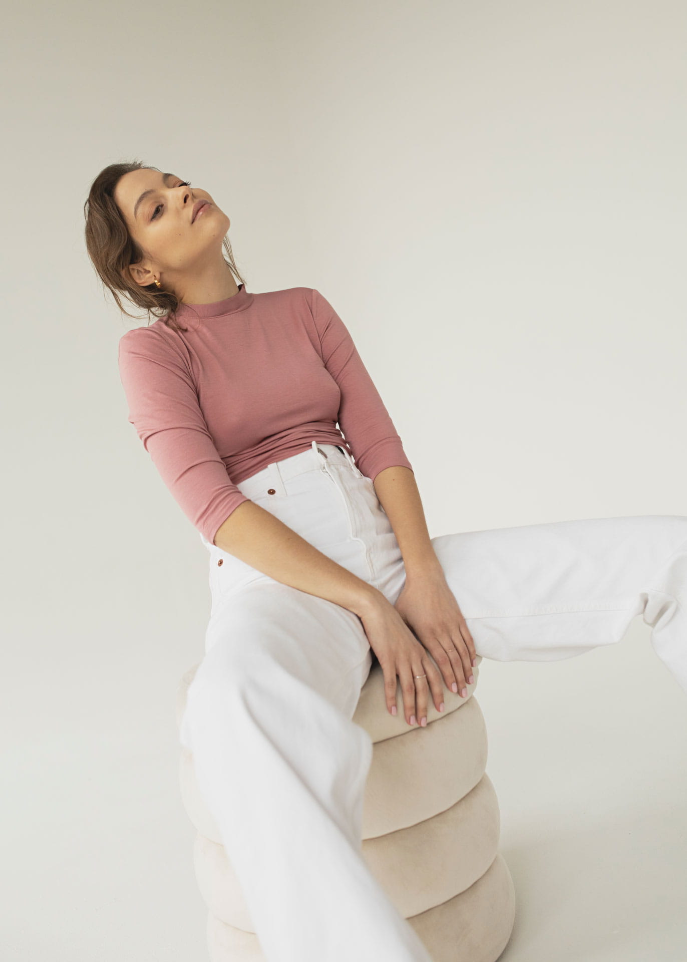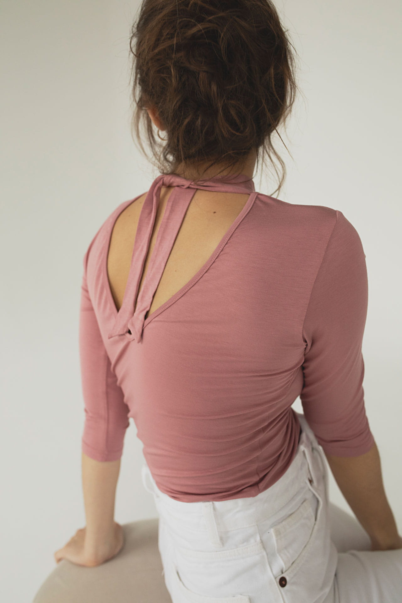 Różowa bluzka z wycięciem na plecach i wiązaniem. Nazwaliśmy ją ROSA, gdyż jest delikatna jak płatek róży, a przy tym tak dostojna i kobieca. Odcień różu jest zarazem słodki i wyrafinowany. Bluzka w tym odcieniu różu dobrze łączy się z bielą, szarością i czerwienią. Daje wiele możliwości stylizacyjnych – może to być elegancka bluzka do spódnicy, świetnie też się sprawdzi jako basicowa bluzka do jeansów. Zabudowany dekolt, zakończony niskim półgolfem sprawdzi się w stylizacjach klasycznych, do pracy – dzięki temu, że bluzka wiązana jest na szyi, można ją nosić pod marynarką czy blazerem. Wycięcie z tyłu jest bardzo kobiece, subtelnie uwodzicielskie, a zarazem zachowuje charakter stonowanej elegancji.
