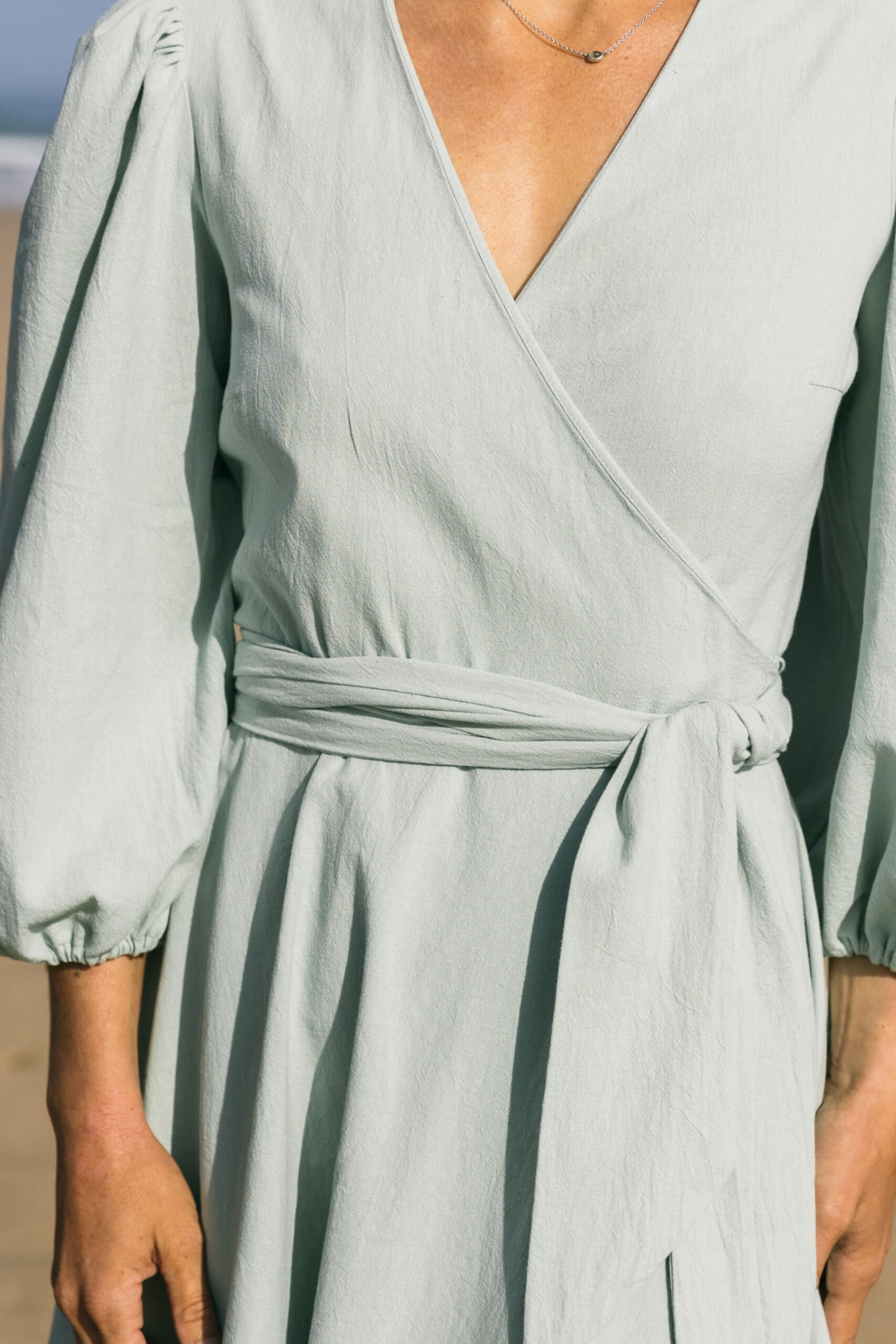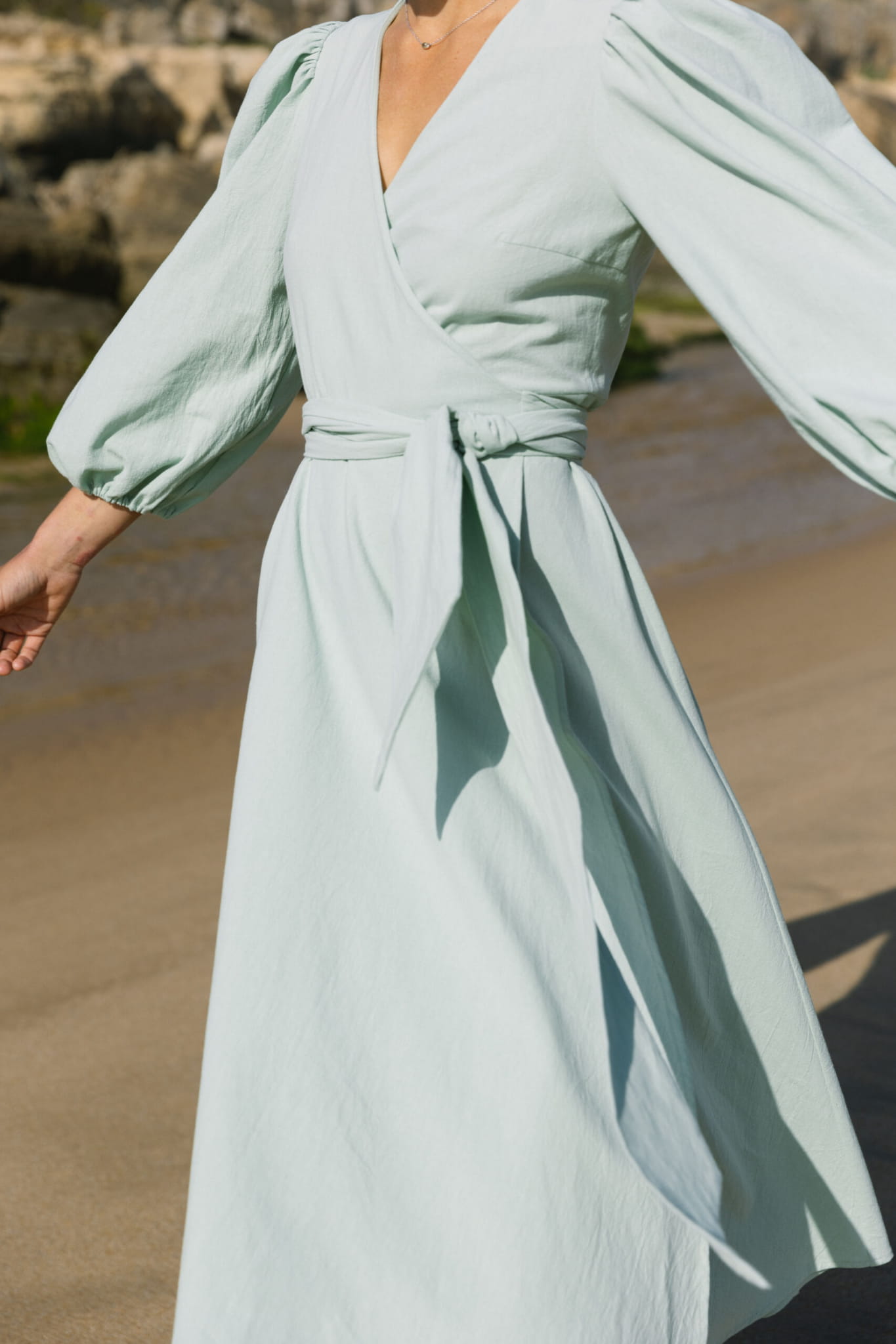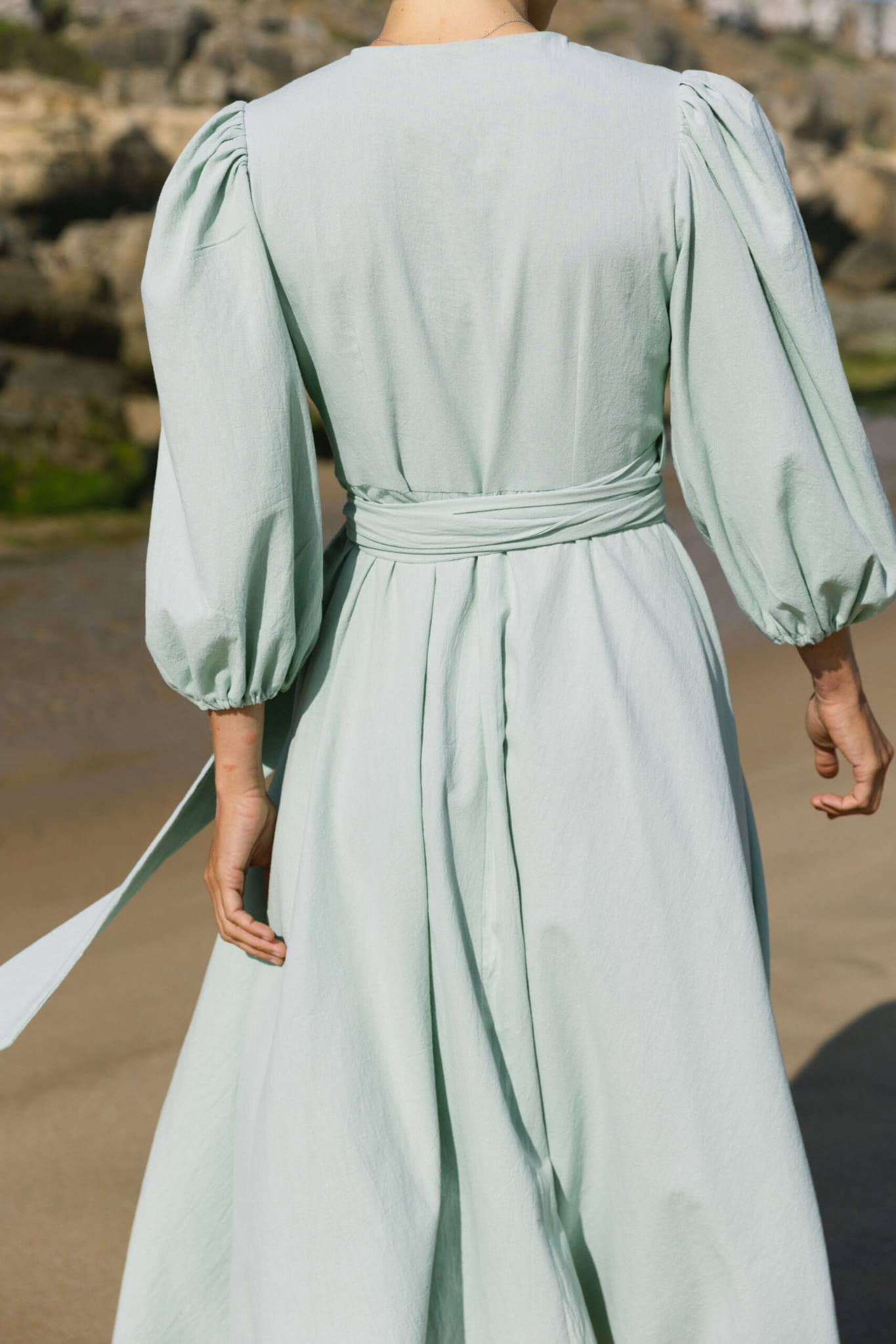 Pistacjowa sukienka kopertowa midi z wiązaniem w talii i bufiastymi rękawami – romantyczna i elegancka, dziewczęca i posągowa, na wyjątkowe okazje i na letni spacer wśród toskańskich wzgórz.