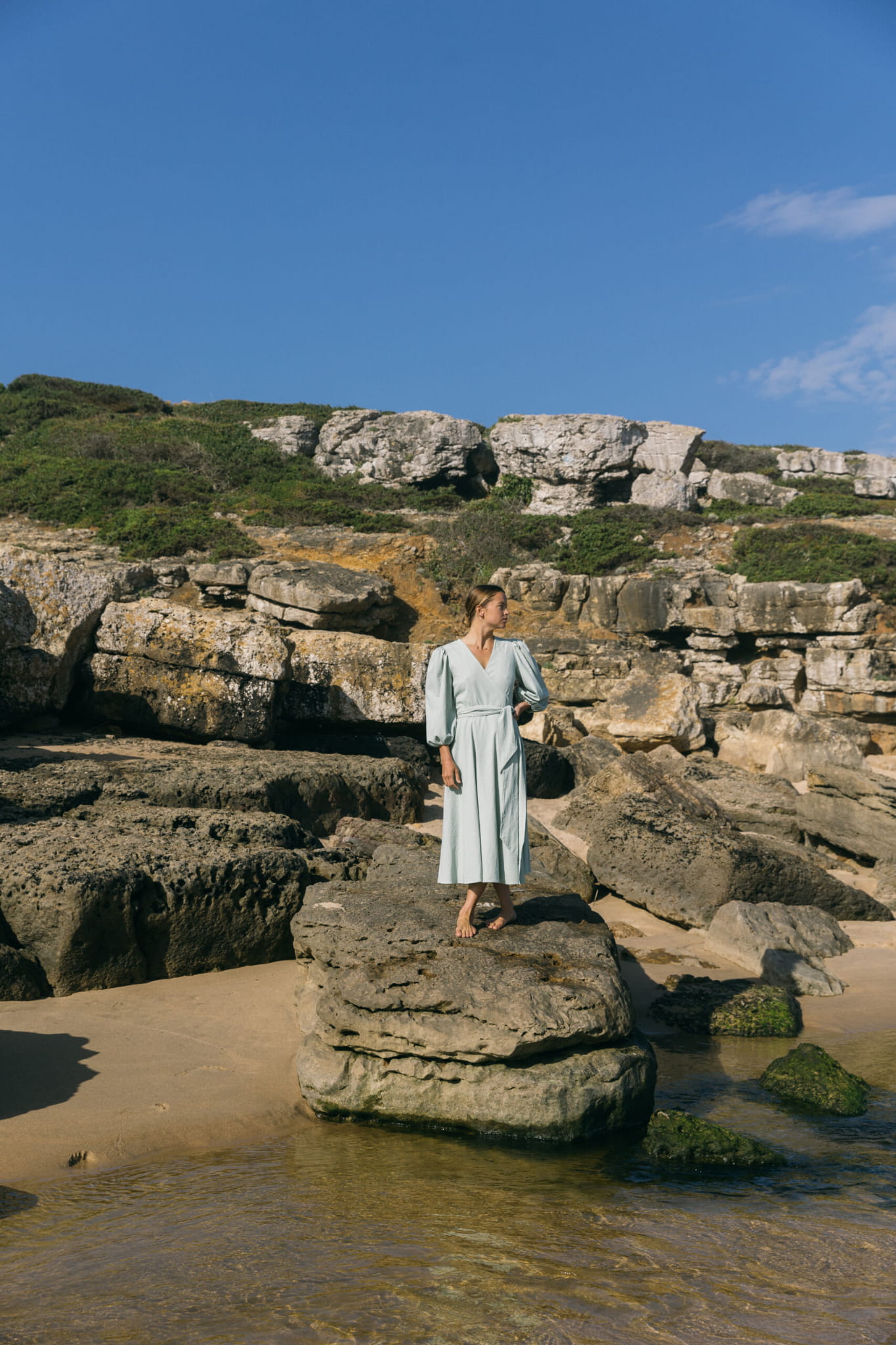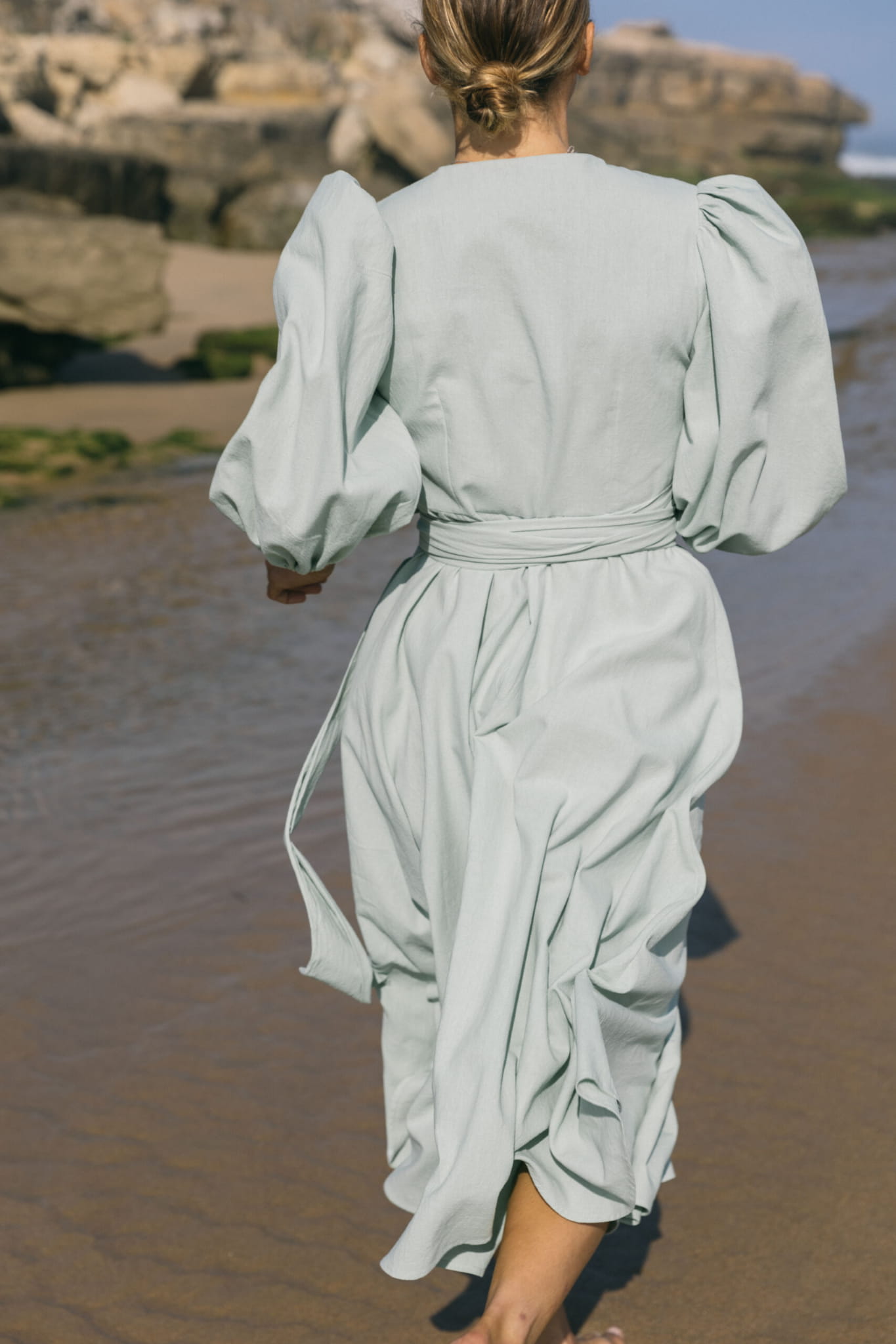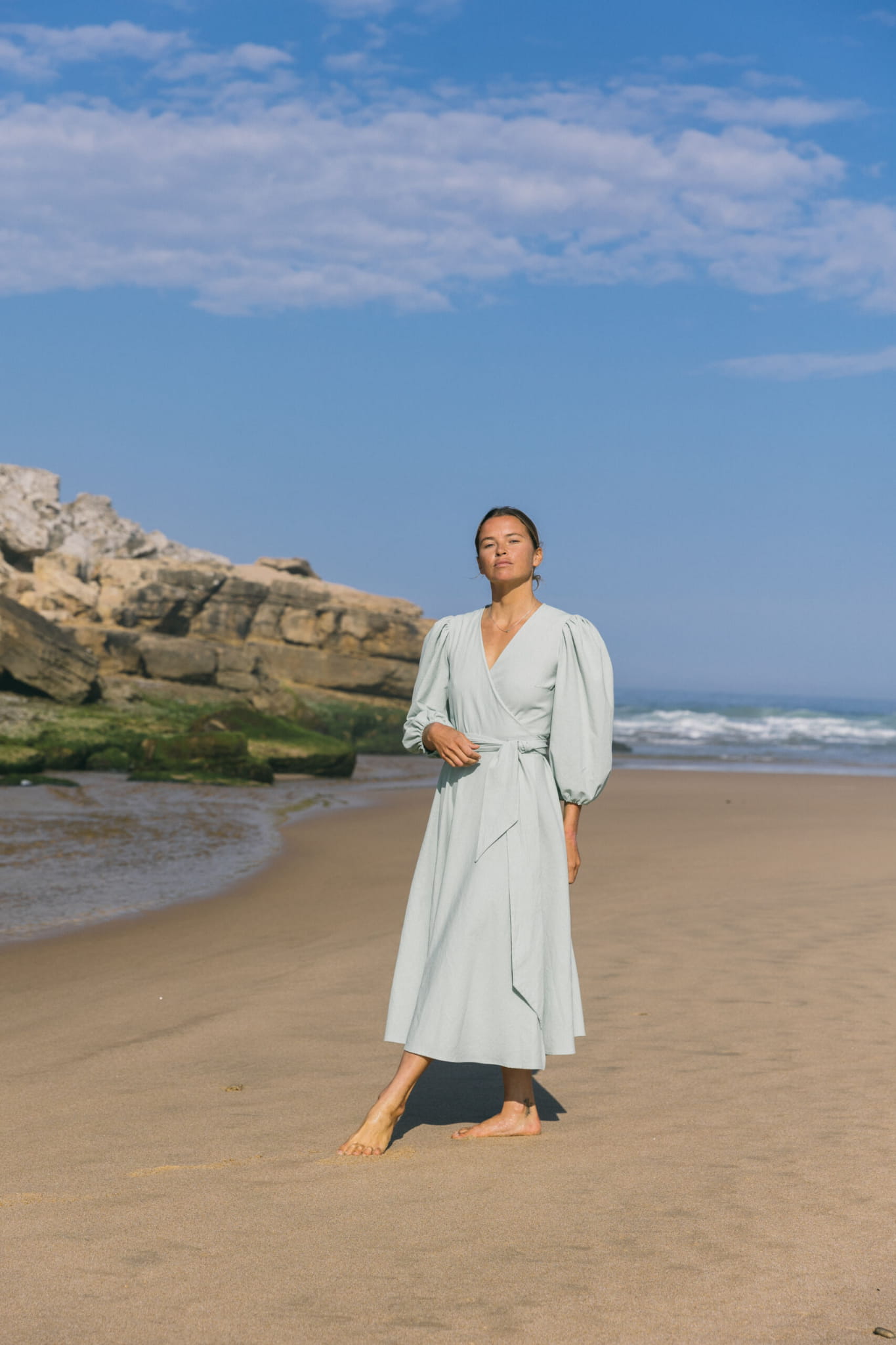 Pistacjowa sukienka kopertowa midi z wiązaniem w talii i bufiastymi rękawami – romantyczna i elegancka, dziewczęca i posągowa, na wyjątkowe okazje i na letni spacer wśród toskańskich wzgórz.