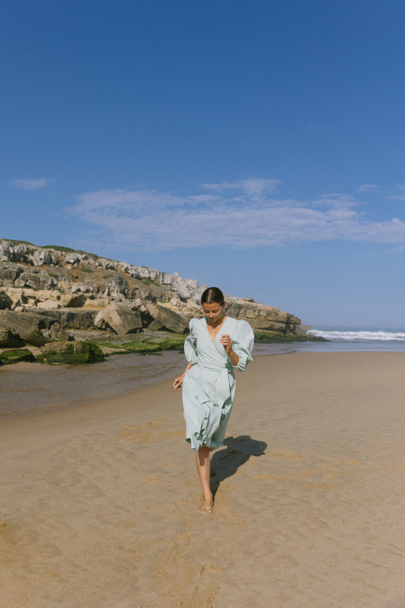 Kolor pistacjowy jest świeży, apetyczny i twarzowy, pięknie komponuje się ze skórą muśniętą słońcem. Krój sukienki kopertowej daje dużą swobodę ruchu – dół sukienki jest rozkloszowany, wycięty z koła, dzięki wiązaniu można ją łatwo dopasować rozmiar w talli oraz głębokość dekoltu.